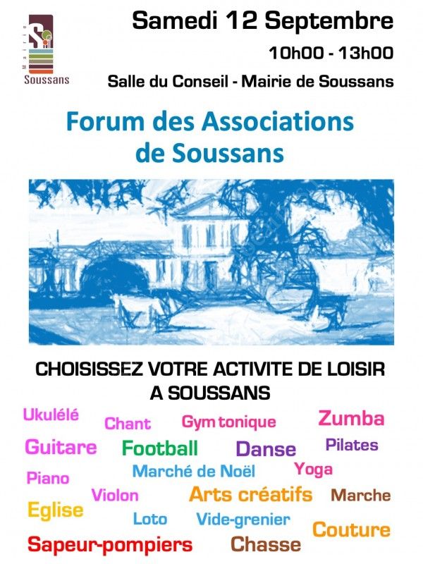 Toutes les Associations de Soussans seront présentes et vous proposeront de nombreux loisirs pour cette nouvelle année 2020-2021.