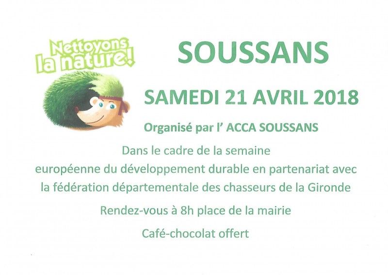 La journée Nature Propre est organisée par l'ACCA de Soussans dans le but de nettoyer la commune des déchets jetés le long des routes ou entreposés sauvagement dans nos bois et forêts.