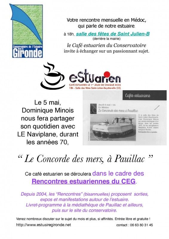 Le café estuarien en rive gauche du CEG et Dominique MINOIS vous feront remonter les temps modernes jusqu'aux années 70 afin de retracer les multiples épisodes vécus après la décision prise de l'implantation à Pauillac du projet Naviplane.... " le Concorde des Mers ! "