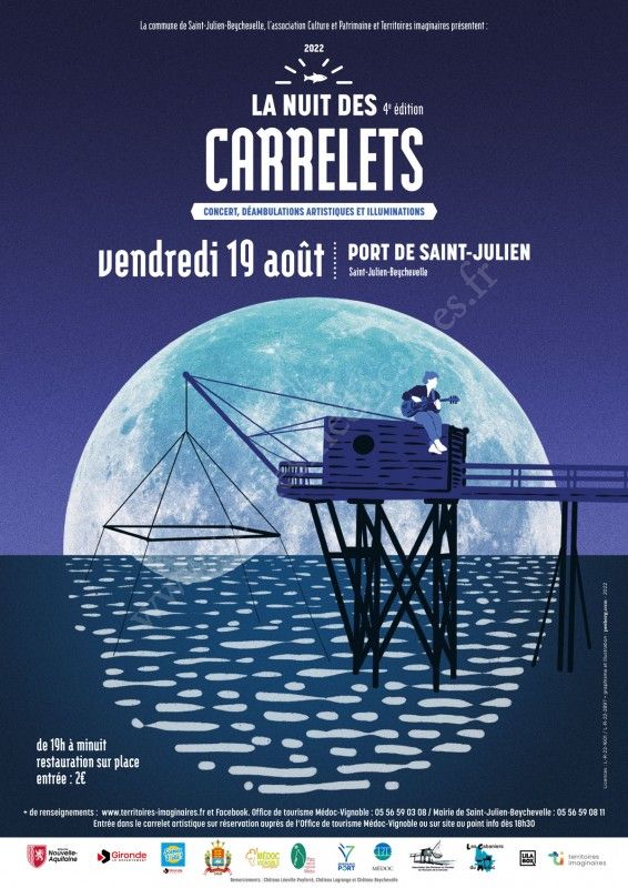 Un territoire porteur de rêves et d'imaginaire, un port singulier, des carrelets perchés au-dessus de l'eau, un estuaire changeant au rythme des couleurs, du ciel et des marées. Des paysages sauvages où l'on aime se reposer. C'est dans ce cadre inspirant que Territoires imaginaires a conçu, en collaboration avec l'Association Culture et Patrimoine de Saint-Julien-Beychevelle, une nouvelle Nuit des carrelets riche d'instants de découvertes artistiques, de poésie et de contemplation.