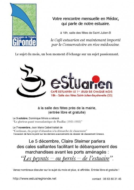 Un exposé suivi d'un échange et d'un pot, sur un theme tournant autour de l'estuaire, proposé par le Conservatoire de la Gironde.