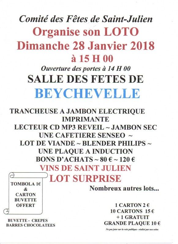 LE COMITE DES FETES DE ST JULIEN ORGANISE SON LOTO LE DIMANCHE 28 JANVIER 2018