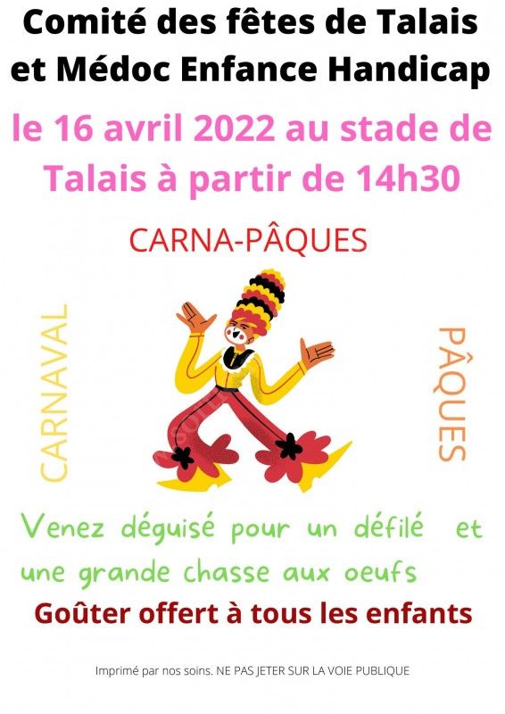 Le Comité des Fêtes de Talais et Médoc Enfance Handicap vous propose "Carna'Pâques".