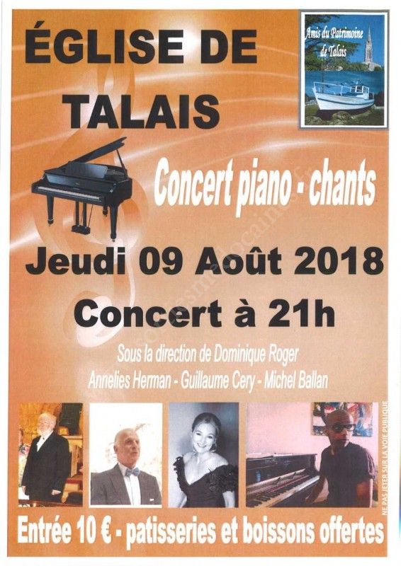 L'Association des Amis du Patrimoine de Talais organisent un concert exceptionnel, par la qualité des chanteurs, dont Annélie HERMAN , Michel BALLAN et des musiciens, dont Dominique Roger et Guillaume CIERY.