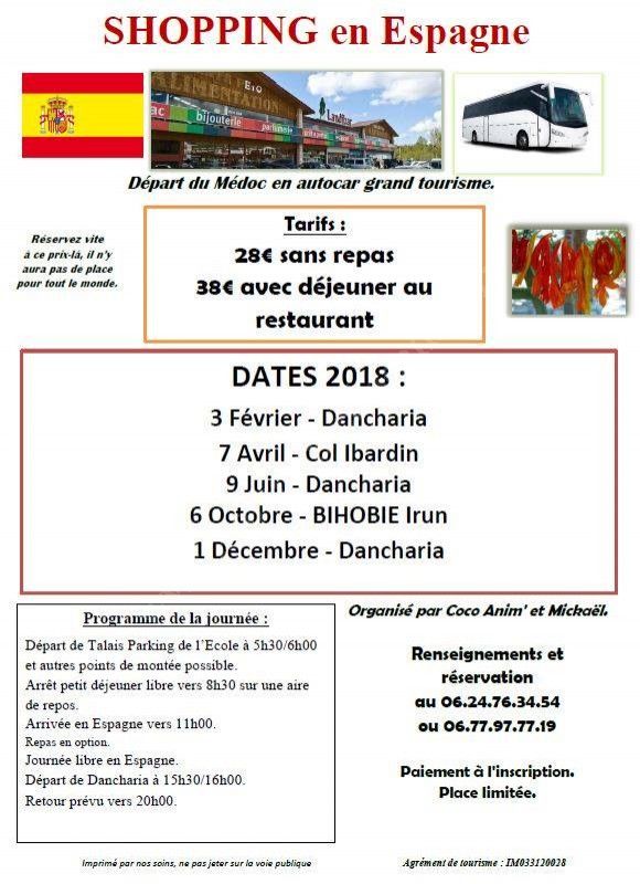 Départ en bus grand tourisme à 06h00 Parking Ecole de Talais et arrêt possible sur le trajet (Saint Vivien du médoc, Gaillan en Médoc, Lesparre, Listrac, Castelnau, Le Taillan en Médoc, …etc….)