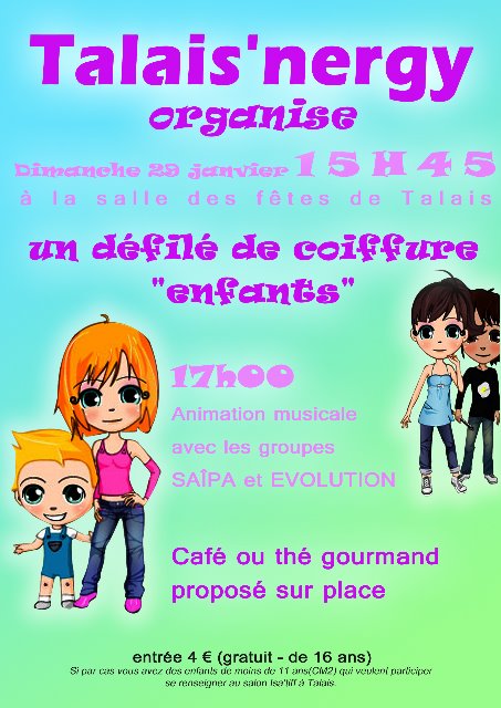 L'association TALAIS'NERGY organise un "Défilé de coiffure enfant" (de 2 ans à 11 ans).