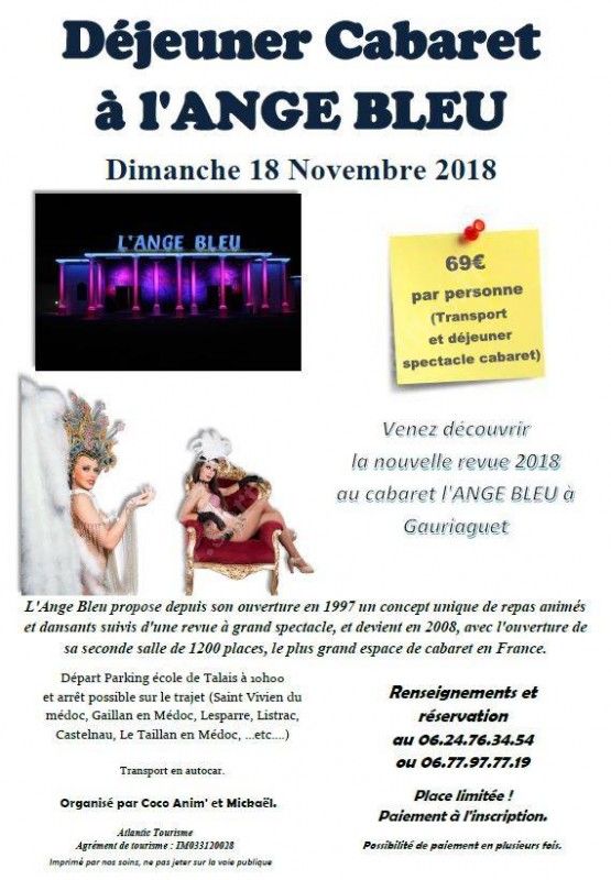 Suite aux nombreux rassemblements, blocages et manifestations prévus à partir du 17 novembre 2018, COCO'ANIM et Mickaël a décidé (après concertation avec l'ange bleu, l'autocariste et notre agence de voyage) de reporter le déjeuner cabaret à l'ANGE BLEU au Dimanche 27 Janvier 2019, celui-ci initialement prévu le Dimanche 18 Novembre 2018.