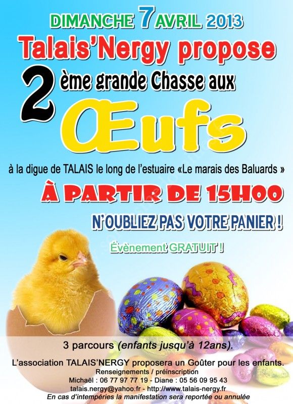 L'association TALAIS'NERGY organise une "Grande chasse aux Œufs de Pâques" au "Marais de Baluards" à la digue de TALAIS le long de l'estuaire (ancien parc ostréicole Saubesty) au bout de la piste cyclable.