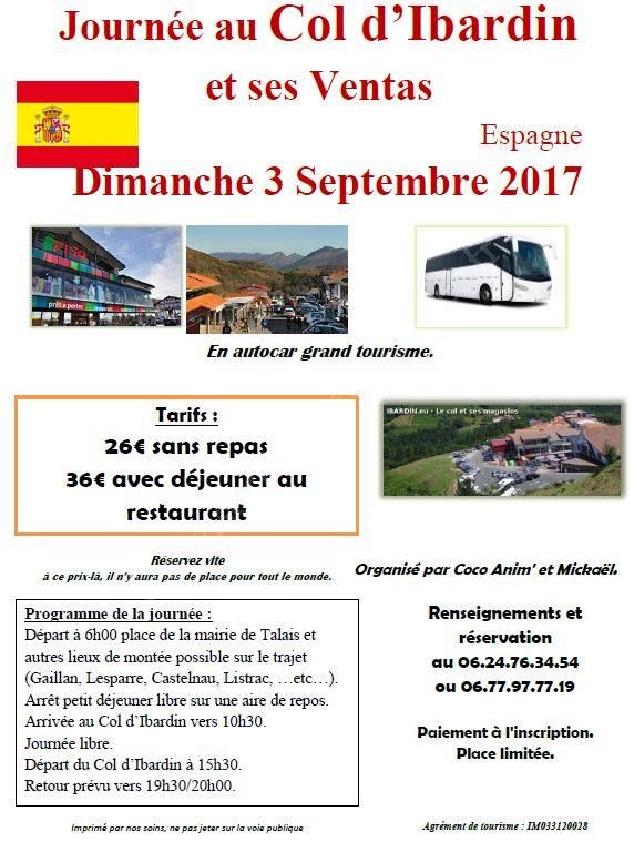 - Départ en bus grand tourisme à 6h00 de la place de la mairie de Talais et arrêt possible sur le trajet (Saint Vivien du médoc, Gaillan en Médoc, Lesparre, Listrac, Castelnau, Le Taillan en Médoc, …etc….)