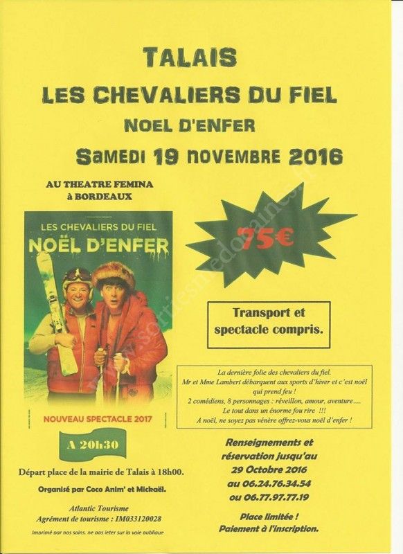 Renseignements et réservation jusqu'au 29 Octobre 2016 par téléphone.