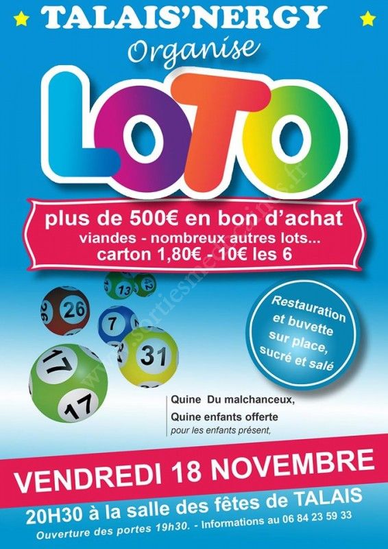 L'association TALAIS'NERGY organise un LOTO le Vendredi 18 Novembre 2016.