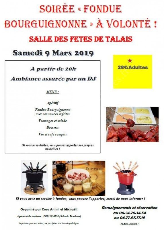 Soirée "Fondue Bourguignonne" à volonté à la SALLE DES FÊTES DE TALAIS, le Samedi 9 Mars 2019.