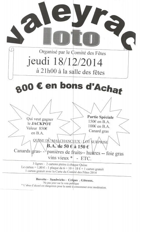 GRAND LOTO DE NOEL ORGANISE PAR LE COMITE DES FETES ET DERNIER LOTO DE L ANNEE.