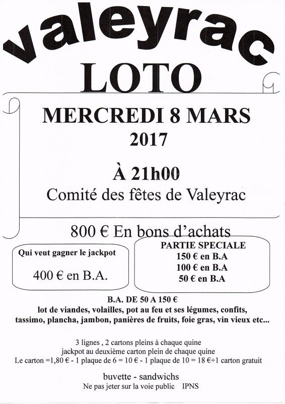 le comité des fetes de valeyrac organise un loto le 08/03/2017.