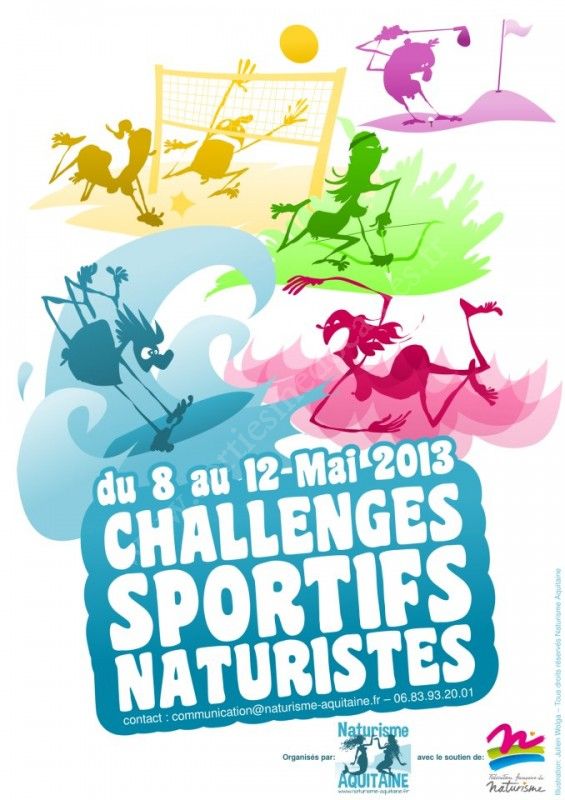 La 2ème édition des CHALLENGES SPORTIFS NATURISTES rganisés par NATURISME AQUITAINE avec le soutien de la FEDERATION FRANCAISE DE NATURISME se déroulera du 8 au 12 Mai 2013 sur 4 villages de vacances naturistes du littoral aquitain.