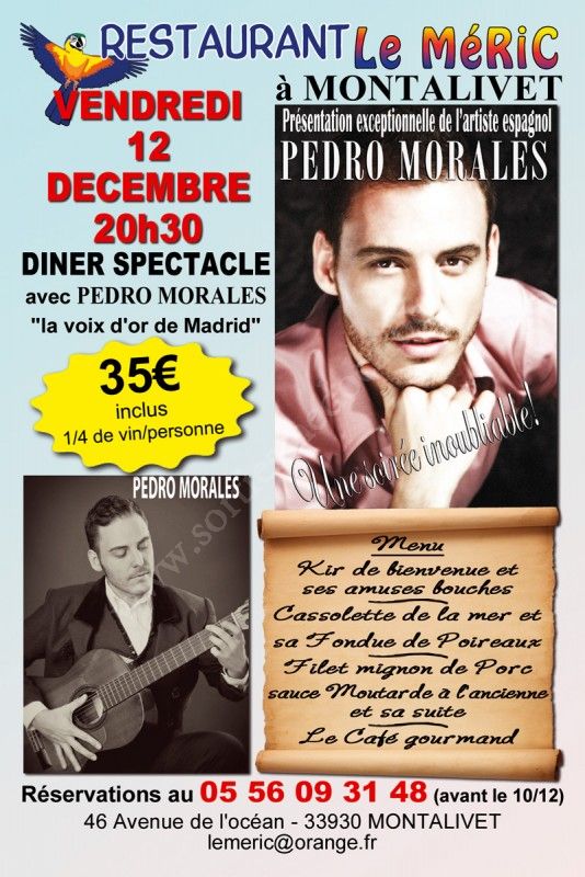 Le restaurant Le Méric vous invite à un dîner spectacle avec la présence exceptionnelle de l'artiste espagnol "Pedro Morales" (La voix d'or de Madrid)