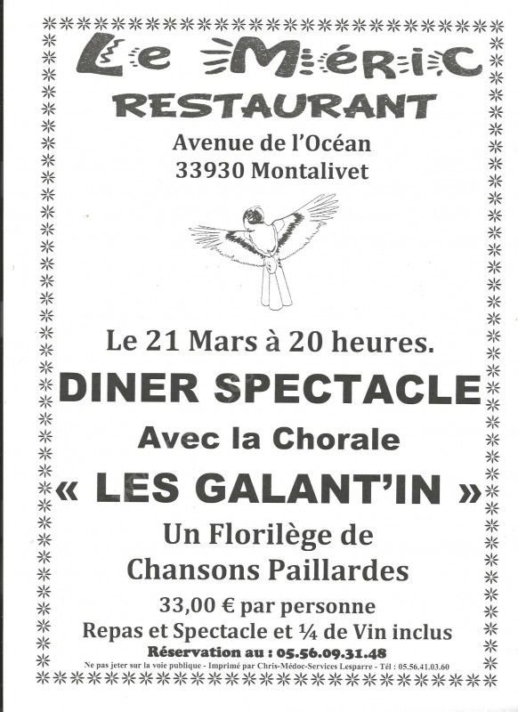- 33 € (Repas, spectacle et 1/4 de vin inclus)