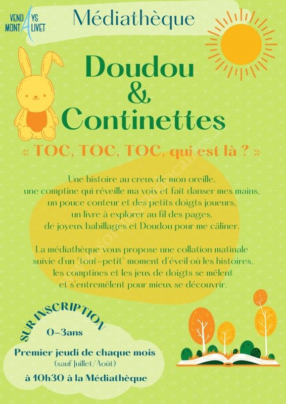 La médiathèque de Vendays-Montalivet propose une collation matinale suivie d'un "tout-petit" moment d'éveil et d'histoires, les comptines et les jeux de doigts se mêlent et s'entremêlent pour mieux se découvrir.