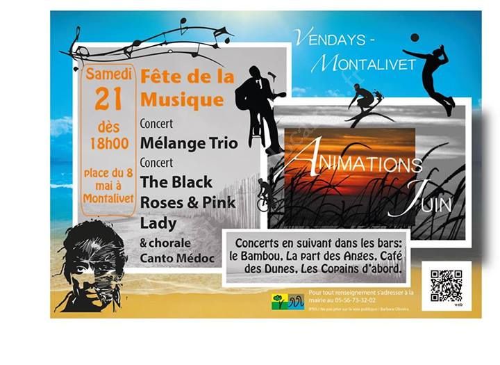 Dès 18h00, Place du 8 mai à Montalivet : Concert Mélange Trio, Concert The Black Roses & Pink Lady, Chorale Canto Médoc.