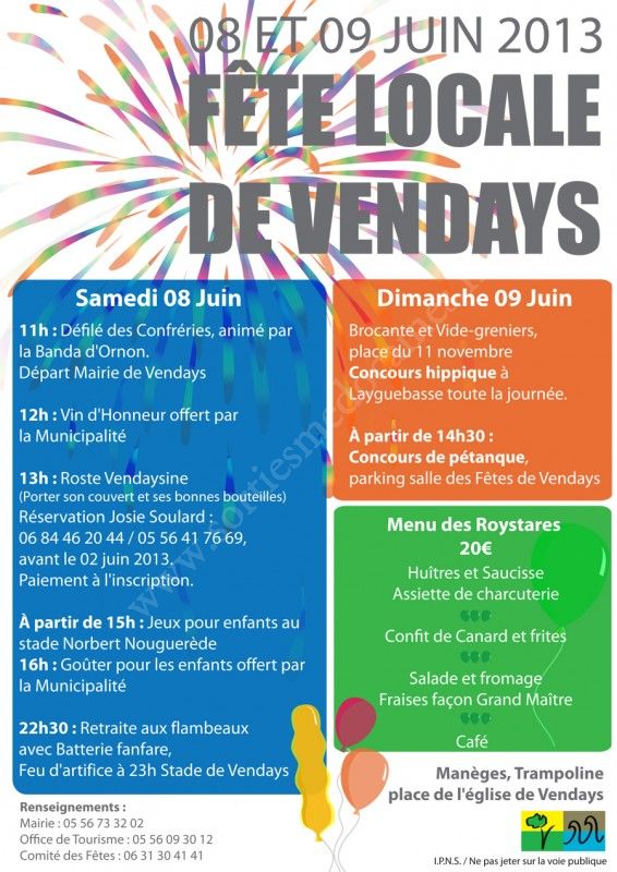 - 13h00 : Roste Vendaysine (porter son couvert et ses bonnes bouteilles) - Sur réservation auprès de Josie Soulard au 05.56.41.76.69 ou 06.84.46.20.44 avant le 2 juin - Paiement à l'inscription