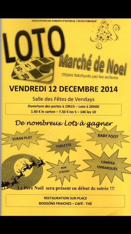 L'école publique de Vendays et l'association des Parents d'Eleves organisent le marché de Noël (objets fabriqués par les enfants) et le loto.