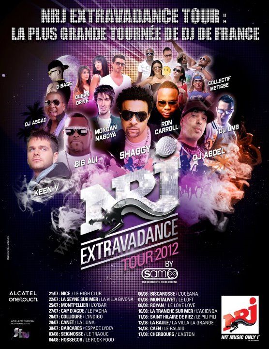 - Le soir, les plus grandes boîtes de nuit de chaque station accueilleront les soirées "NRJ EXTRAVADANCE TOUR 2012 by Sam" avec le son des DJs de la team NRJ Extravadance, émission radio référence du clubbing et de la dance : aux platines BIG ALI, DJ ASSAD, DMB, Morgan Nagoya... mais aussi les shows des artistes guests : Keen V, Collectif Métissé, Shaggy, Matt Houston, Ocean Drive et les 5 Djettes finalistes du concours "She Can DJ", lancé par NRJ et EMI France Music.