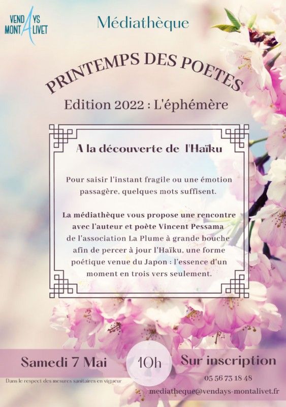 La Médiathèque de Vendays vous propose une rencontre avec l’auteur et poète Vincent Pessama de l’association La Plume à grande bouche afin de percer à jour l’Haïku, une forme poétique venue du Japon : l’essence d’un moment en trois vers seulement.