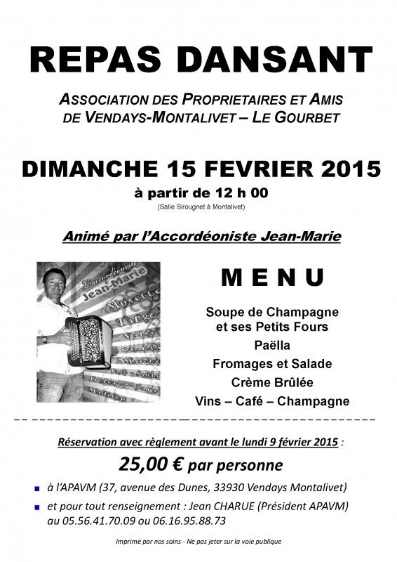 L'association des propriétaires et amis de Vendays-Montalivet - Le Gourbet, organise un repas dansant animé par l'accordéoniste Jean-Marie.
