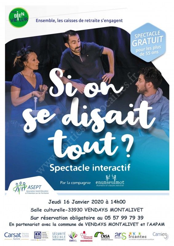 L’ASEPT Gironde et la Compagnie EnUNSeulMot vous donnent rendez-vous le jeudi 16 janvier 2020 à 14h00 à la Salle culturelle de Vendays-Montalivet pour assister au spectacle « Si on se disait tout ? ».