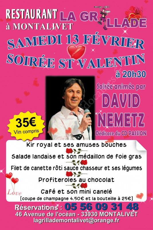 Le Restaurant La Grillade organise une soirée spéciale "Saint Valentin", animée par David Nemetz.