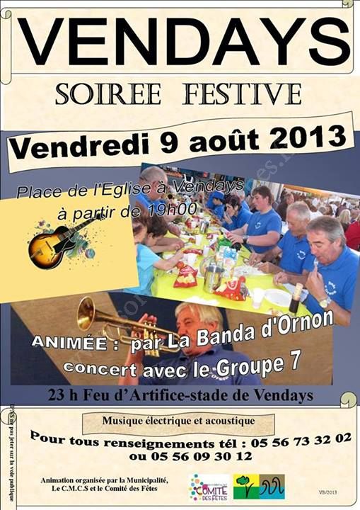 Soirée Festive animée par la Banda d’Ornon avec concert Groupe 7 – Musique électrique et acoustique - Place de l’Eglise à Vendays à partir de 19h00.