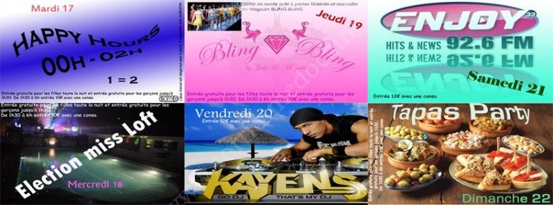 L'entrée pour les filles est gratuite toute la nuit. Pour les garçon, l'entrée est gratuite jusqu'à 1h30. De 1h30 à 6h, l'entrée est à 10€ avec une conso. - Mercredi 18 juillet : Election Miss Loft