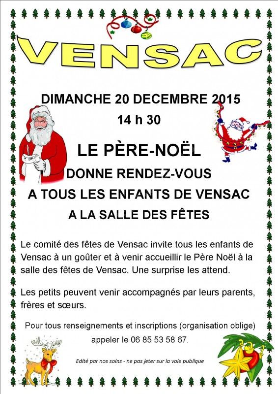 Le Comité des Fêtes de Vensac invite tous les enfants de Vensac à un goûter et à venir accueillir le Père Noël.