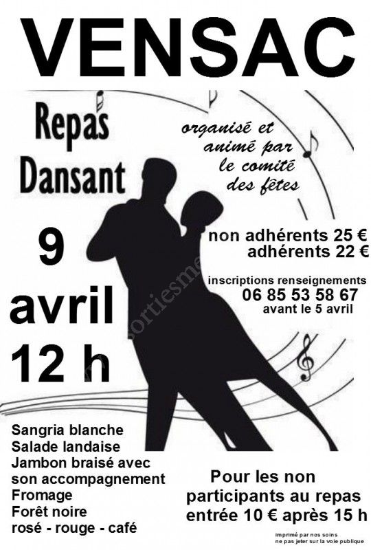 Repas + bal : 22€ adhérent, 25€ non adhérents, 15€ enfants