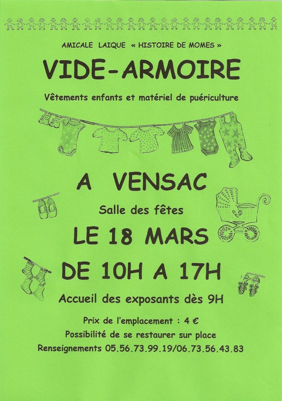 L'Amicale Laïque "Histoire de Mômes" du R.P.I (VENSAC/GRAYAN/TALAIS) organise un VIDE-ARMOIRE