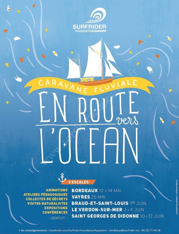 Le bureau Surfrider Aquitaine lance pour la première année sa caravane « En route vers l’océan » du 12 mai au 12 juin afin de sensibiliser les citoyens au problème des déchets aquatiques, particulièrement présents sur les littoraux de la région.