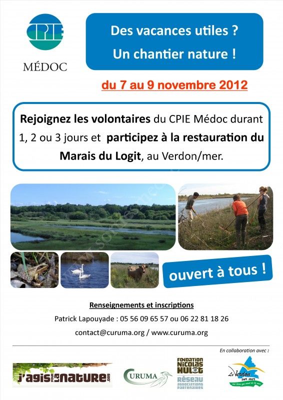 Durant 3 jours, l’association « Curuma », labellisée CPIE Médoc, organise une action de préservation de la biodiversité en collaboration avec la Commune du Verdon-sur-Mer. Du 7 au 9 novembre, pendant les vacances de la Toussaint, sur le site du Marais du Logit, géré par le CPIE Médoc, et propriété de la commune du Verdon-sur-Mer et du Conseil Général de la Gironde, les éco volontaires participeront durant 1, 2 ou 3 jours selon leur disponibilité, à des travaux de restauration de zones humides estuariennes. Dégradées ou détruites pour moitié ces quarante dernières années, les zones humides abritent une biodiversité particulièrement sensible aux atteintes portées aux écosystèmes. Restaurer ou valoriser un marais contribue à la préservation de ces milieux naturels sensibles et de leur biodiversité incomparable.