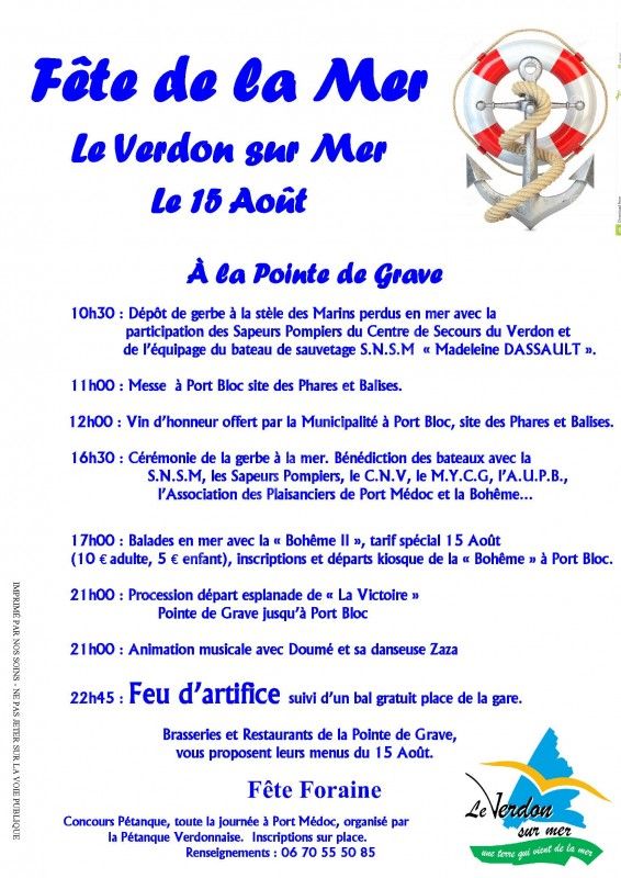 - 16h30 : Cérémonie de la gerbe à la mer. Bénédiction des bateaux avec la S.N.S.M, les Sapeurs Pompiers, le C.N.V, le M.Y.C.G, l’A.U.P.B., l’Association des Plaisanciers de Port Médoc et la Bohême...