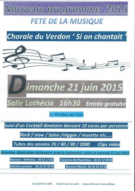 Fête de la Musique avec la Chorale du Verdon "Si on Chantait" (entrée gratuite).