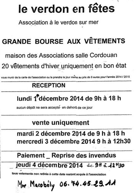 - Jeudi 4 décembre 2014 de 9h00 à 12h30 - tous vêtements non retirés à cette date restent acquis à l'association