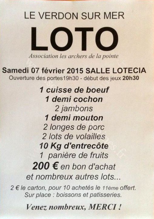 Notre association Les archers de la pointe organise le samedi 7 février 2015 un loto sur la commune du Verdon sur mer.