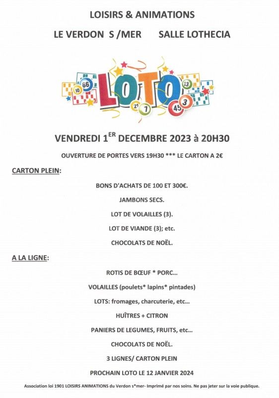 Ouverture des portes vers 9h30. Début du loto 20h30.