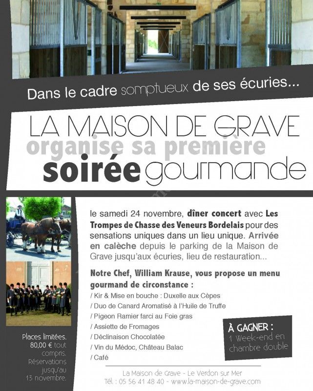 Ce 24 novembre, La Maison de Grave (Gîte d'étape relais équestre) vous invite à sa première soirée gourmande : une soirée athypique dans les écuries qui seront aménagées en salle de réception.