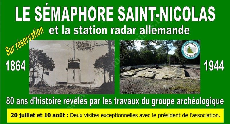 Pour deux visites exceptionnelles seulement, le président du groupe archéologique " Forteresse Gironde Sud - Groupe archéologique " vous accompagnera en immersion dans l’histoire du sémaphore Saint-Nicolas, de sa construction et ses évolutions au cours des XIXème et XXème siècles, à sa démolition en 1944 pour laisser place à une station radar allemande.