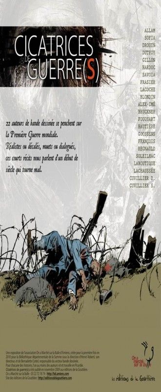 Issue du livre Cicatrices de guerre(s),l'exposition propose 15 histoires courtes, écrites et dessinées par 22 auteurs, autour de la Première Guerre mondiale : la vie dans les tranchées, les gueules cassées, les mutineries de 1917, les déserteurs, mais aussi les affaires des industriels ou la correspondance avec les familles et le quotidien des enfants loin des combats...