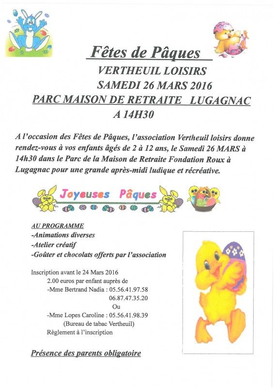 A l'occasion des Fêtes de Pâques, l'association Vertheuil Loisirs donne rendez-vous à vos enfants âgés de 2 à 12 ans, le samedi 26 mars 2016, pour une grande après-midi ludique et récréative.
