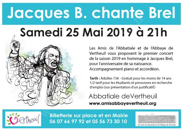Les Amis de l'Abbatiale et de l'Abbaye de Vertheuil vous proposent le premier concert de la saison 2019 en hommage à Jacques Brel, pour l'anniversaire de sa naissance.
