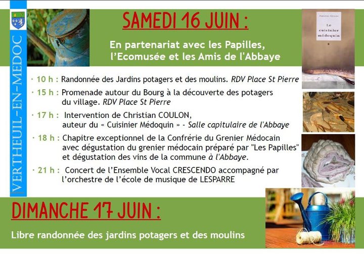 - 18h : Chapitre exceptionnel de la Confrérie du Grenier Médocain avec dégustation du grenier Médocain préparé par "Les Papilles" et dégustation des vins de la commune de l'Abbaye.