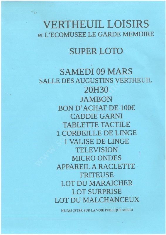 Loto organisé par Vertheuil Loisirs et l'Ecomusée Le Garde Mémoire le samedi 9 mars 2019.
