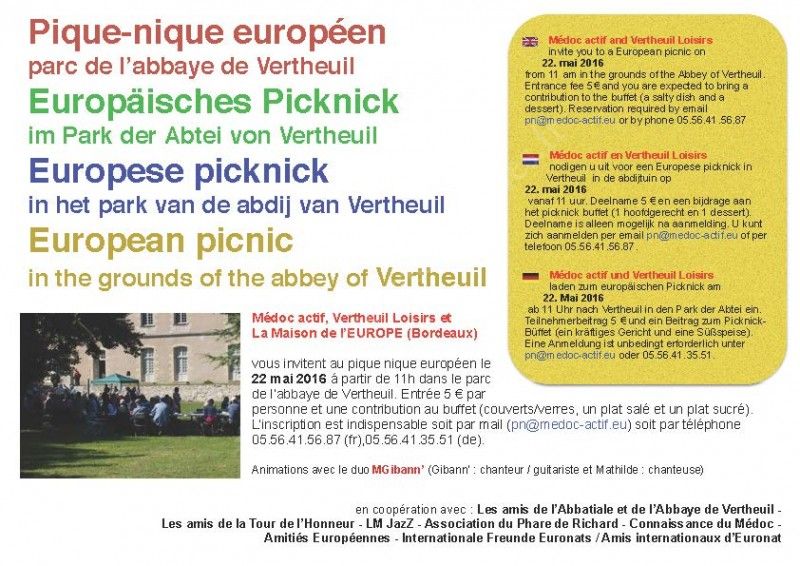 MEDOC ACTIF, Vertheuil Loisirs et la Maison de l'Europe vous invitent au pique nique européen.